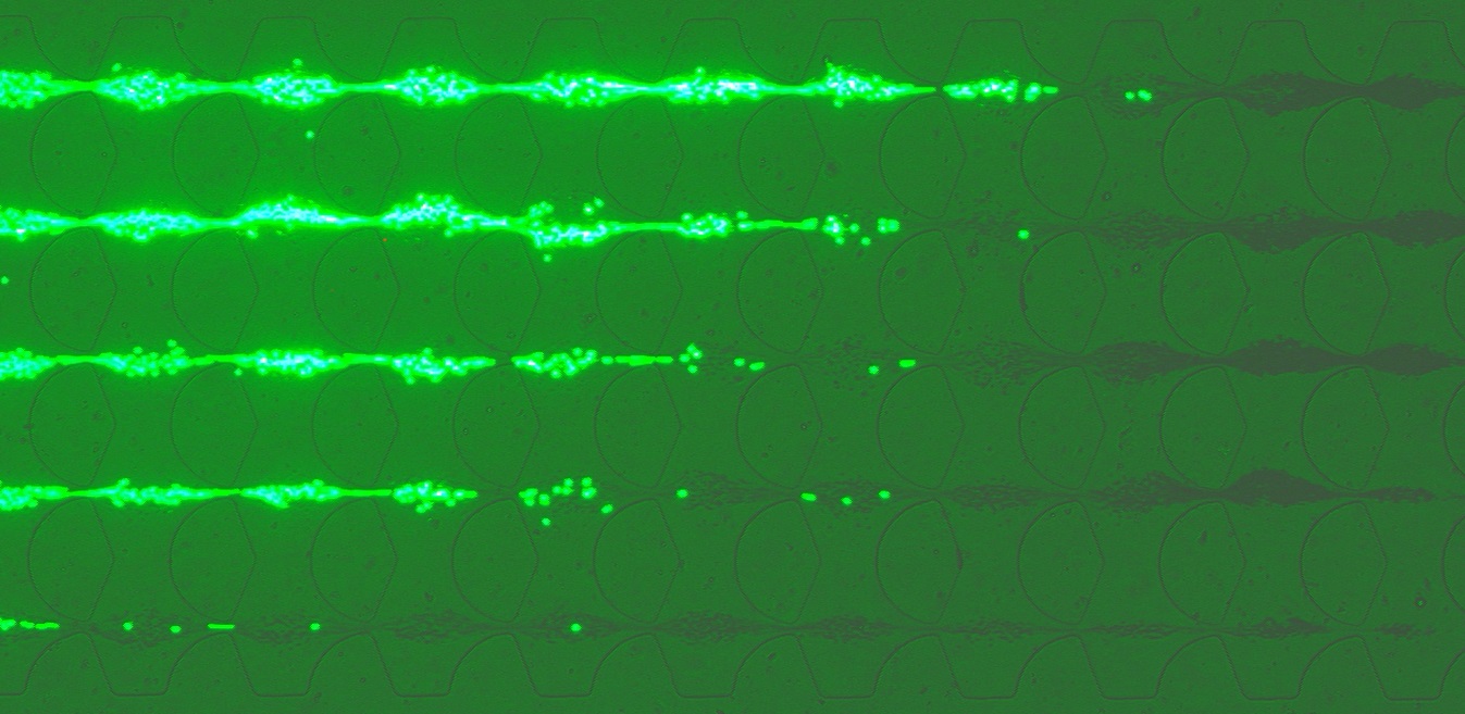 5 um green fluorescent spherical polystyrene particles and 5 µm non-fluorescent peanut particles exhibiting a streaming regime in an insulator-based microfluidic channel